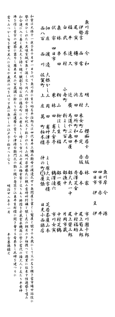 今茲<こんじ>還暦に当り、今津源右衛門氏の勧めに随い、寿筵を江東井生村楼に開き、会する者甚だ多し。この碑を建つるに当り、みずから句を書す。その、人に交わるや義侠の心を以てす。真に魚川岸の江戸っ子と称すべきなり。